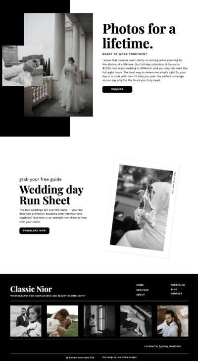 Classic Noir is a timeless, elegant design with black-and-white imagery, clean lines, and a refined layout — perfect for showcasing your work with effortless sophistication.